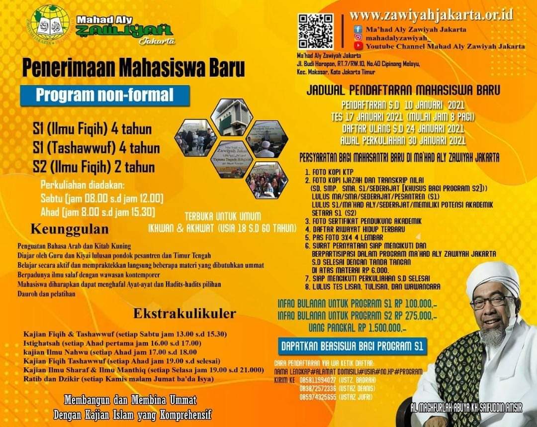 Penerimaan mahasantri baru tahun 2021 Ma’had Aly Zawiyah Jakarta ? Program non-formal S1( Ilmu Fiqih) ➡️ 4 tahun S1( Tashawwuf) ➡️ 4 tahun S2 (Ilmu …