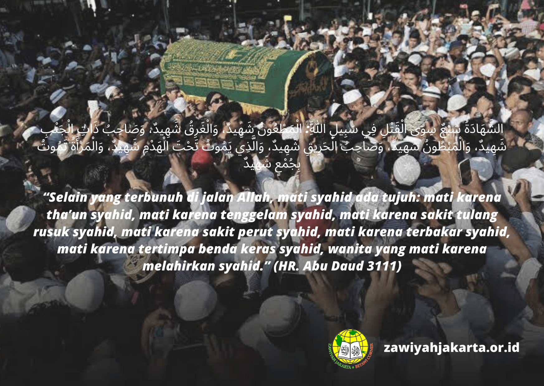 “Selain yang terbunuh di jalan Allah, mati syahid ada tujuh: mati karena tha’un syahid, mati karena tenggelam syahid, mati karena sakit tulang rusuk syahid, mati karena sakit perut syahid, mati karena terbakar syahid, mati karena tertimpa benda keras syahid, wanita yang mati karena melahirkan syahid.” (HR. Abu Daud 3111)
