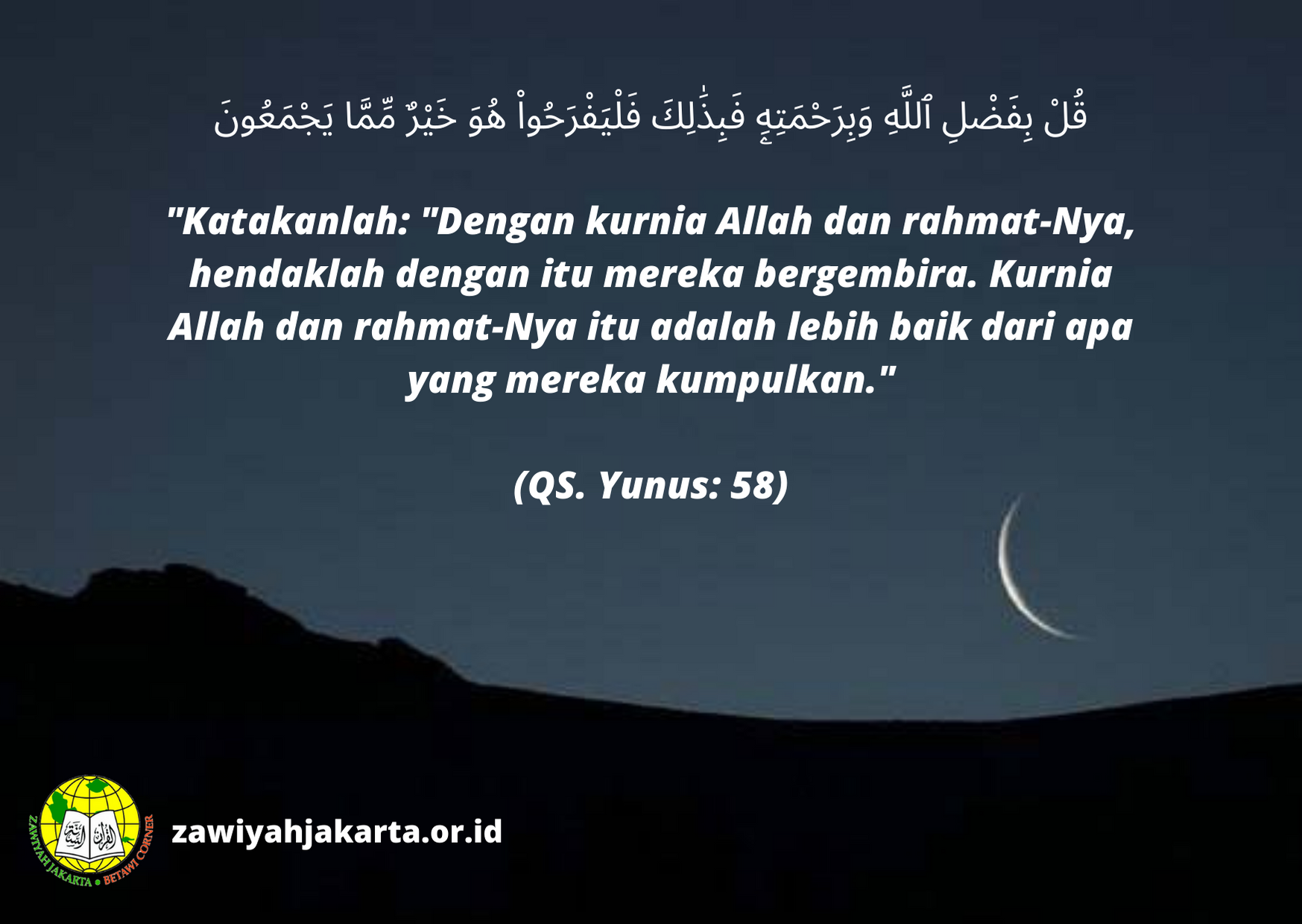 “Katakanlah: “Dengan kurnia Allah dan rahmat-Nya, hendaklah dengan itu mereka bergembira. Kurnia Allah dan rahmat-Nya itu adalah lebih baik dari apa yang mereka kumpulkan.” (QS. Yunus: 58)