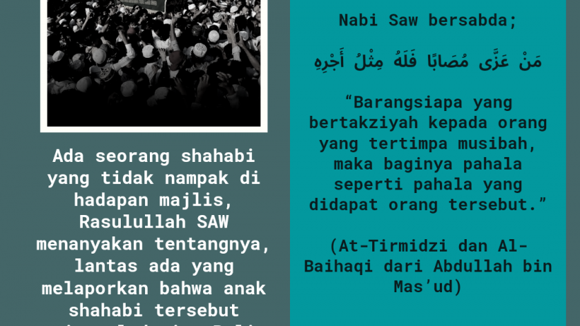 Ada seorang shahabi yang tidak nampak di hadapan majlis, Rasulullah SAW menanyakan tentangnya, lantas ada yang melaporkan bahwa anak shahabi tersebut meninggal dunia. Beliau kemudian mengajak para shahabat bangkit dari tempat duduknya untuk berta’ziah.