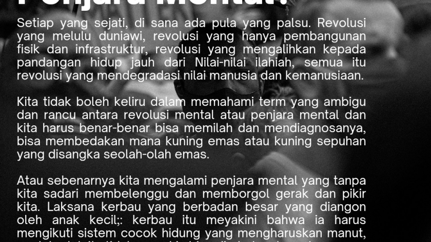 Kita tidak boleh keliru dalam memahami term yang ambigu dan rancu antara revolusi mental atau penjara mental dan kita harus benar-benar bisa memilah dan mendiagnosanya, bisa membedakan mana kuning emas atau kuning sepuhan yang disangka seolah-olah emas.