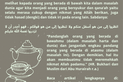Oleh: Hayat Abdul Latief Rasulullah shallallahu ‘alaihi wa sallam memerintahkan kita melihat kepada orang yang berada di bawah kita dalam masalah dunia …