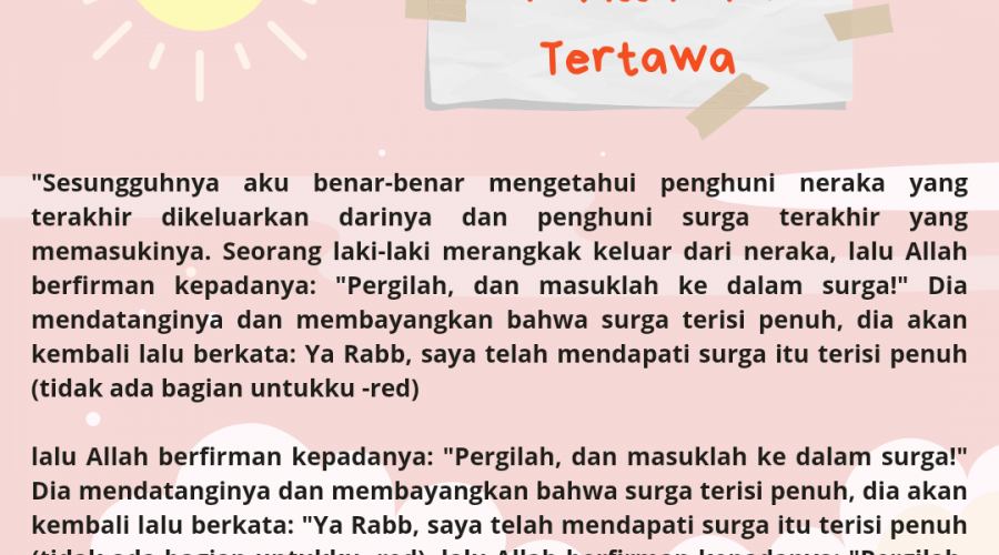 Oleh: Hayat Abdul Latief Beberapa hadits berikut menyebutkan bahwa Allah subhanahu wa ta’ala – dengan keagungan dan kesucian sifat-Nya dari penyerupaan terhadap makhluk – ‘tertawa’: …