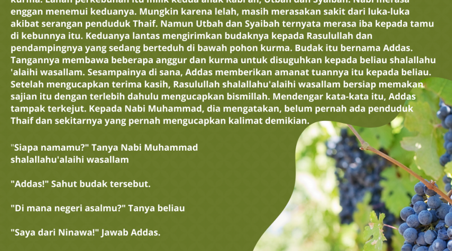 Oleh: Hayat Abdul Latief Tempat Rasulullah SAW beristirahat sehabis dikejar-kejar penduduk Thaif adalah kebun kurma. Lahan perkebunan itu milik kedua anak Rabi’ah; …