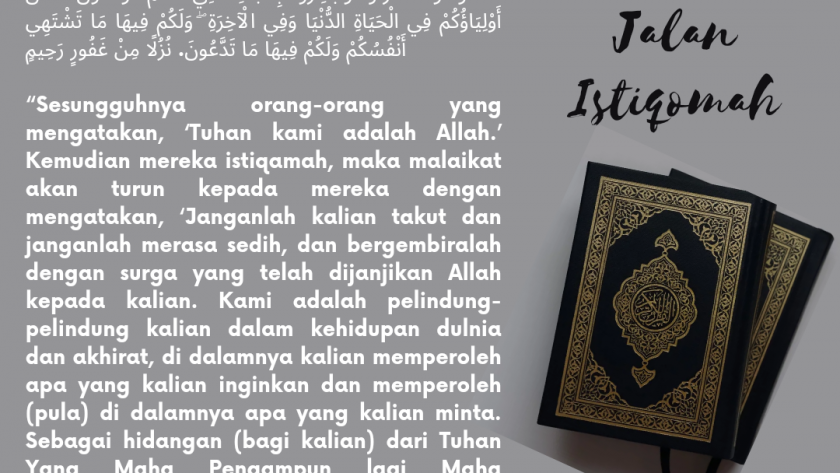 “Sesungguhnya orang-orang yang mengatakan, ‘Tuhan kami adalah Allah.’ Kemudian mereka istiqamah, maka malaikat akan turun kepada mereka dengan mengatakan, ‘Janganlah kalian takut dan janganlah merasa sedih, dan bergembiralah dengan surga yang telah dijanjikan Allah kepada kalian. Kami adalah pelindung-pelindung kalian dalam kehidupan dunia dan akhirat, di dalamnya kalian memperoleh apa yang kalian inginkan dan memperoleh (pula) di dalamnya apa yang kalian minta. Sebagai hidangan (bagi kalian) dari Tuhan Yang Maha Pengampun lagi Maha Penyayang.” (Q.S. Fushshilat: 30-32)