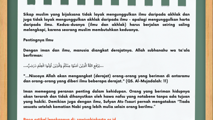 Tulisan ini sebenarnya sebagai jawaban dari 2 status WA seseorang yang menurut saya ada ketimpangan di dalamnya. Status pertama: Mendingan tidak berilmu namun baik akhlaknya karena Nabi Muhammad diutus untuk menyempurnakan akhlak, bukan menyempurnakan ilmu. Status kedua: Dengan banyak harta, maka banyak orang mendekat dan hormat. Tidak ada artinya orang yang berilmu kalau tidak punya harta.
