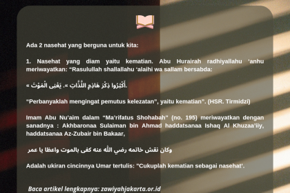 Oleh: Hayat Abdul Latief Ada 2 nasehat yang berguna untuk kita: 1. Nasehat yang diam yaitu kematian. Abu Hurairah radhiyallahu ‘anhu …