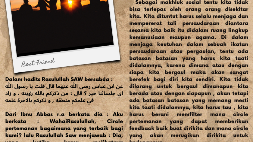 kita tidak dilarang untuk bergaul dimanapun kita berada atau dengan siapapun, akan tetapi ada batasan-batasan yang memang mesti kita taati didalamnya. Kita harus tau dan harus berani memfilter mana circle pertemanan yang dapat memberikan feedback baik buat diri kita dan mana circle yang akan merugikan diri kita untuk kedepannya.