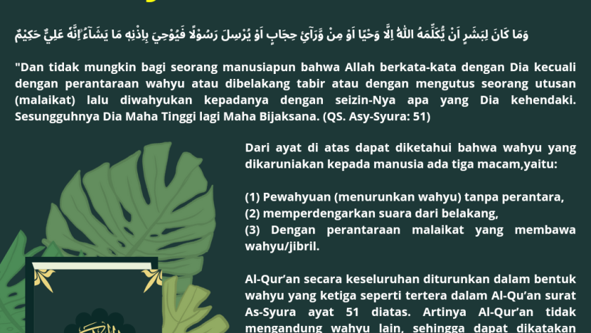 “Dan tidak mungkin bagi seorang manusiapun bahwa Allah berkata-kata dengan Dia kecuali dengan perantaraan wahyu atau dibelakang tabir atau dengan mengutus seorang utusan (malaikat) lalu diwahyukan kepadanya dengan seizin-Nya apa yang Dia kehendaki. Sesungguhnya Dia Maha Tinggi lagi Maha Bijaksana. (QS. Asy-Syura: 51)