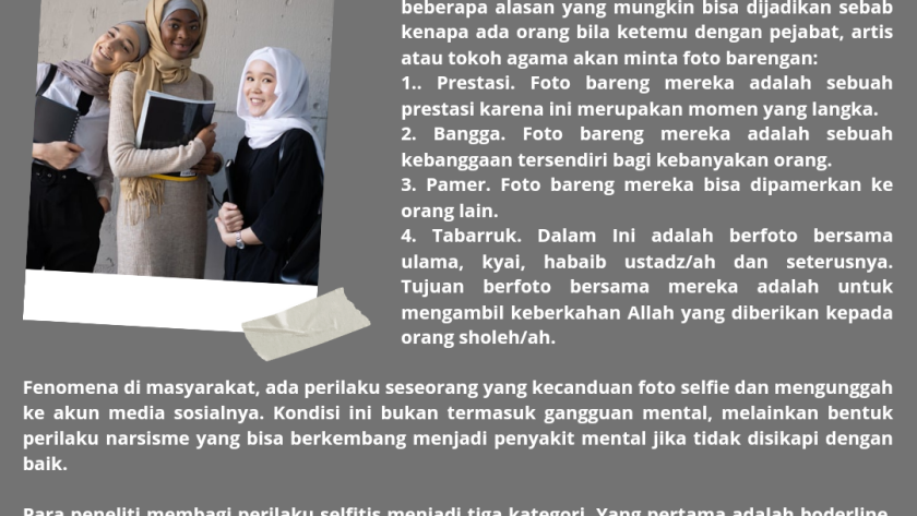 Fenomena selanjutnya adalah bangga berfoto bersama tokoh yang diidolakannya, baik dengan penguasa ataupun artis yang ternama. Inilah beberapa alasan yang mungkin bisa dijadikan sebab kenapa ada orang bila ketemu dengan pejabat, artis atau tokoh agama akan minta foto barengan: