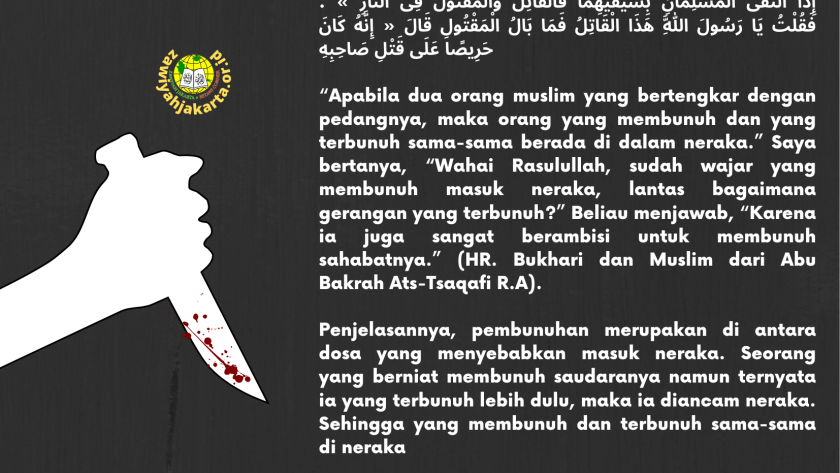 “Apabila dua orang muslim yang bertengkar dengan pedangnya, maka orang yang membunuh dan yang terbunuh sama-sama berada di dalam neraka.” Saya bertanya, “Wahai Rasulullah, sudah wajar yang membunuh masuk neraka, lantas bagaimana gerangan yang terbunuh?” Beliau menjawab, “Karena ia juga sangat berambisi untuk membunuh sahabatnya.” (HR. Bukhari dan Muslim dari Abu Bakrah Ats-Tsaqafi r.a).