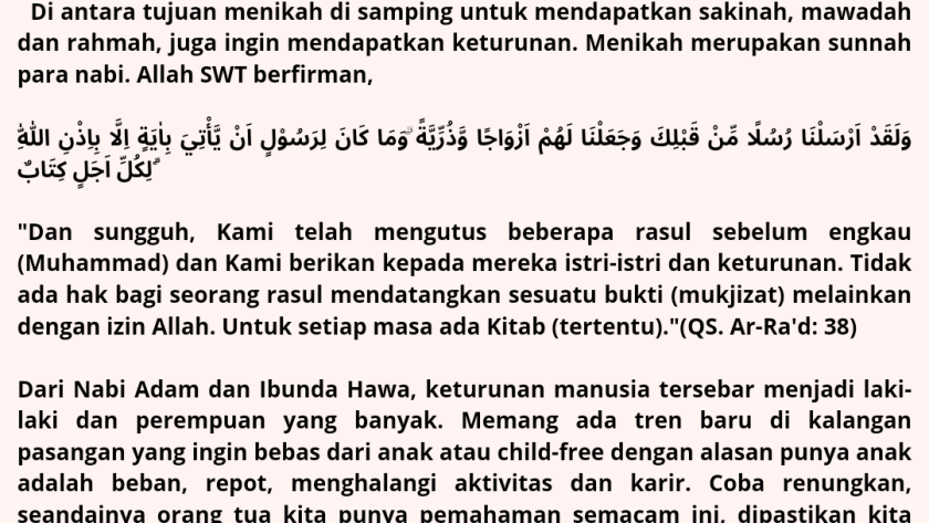 Dari Nabi Adam dan Ibunda Hawa, keturunan manusia tersebar menjadi laki-laki dan perempuan yang banyak. Memang ada tren baru di kalangan pasangan yang ingin bebas dari anak atau child-free dengan alasan punya anak adalah beban, repot, menghalangi aktivitas dan karir. Coba renungkan, seandainya orang tua kita punya pemahaman semacam ini, dipastikan kita tidak ada. Wal ‘Iyyadz Billah.