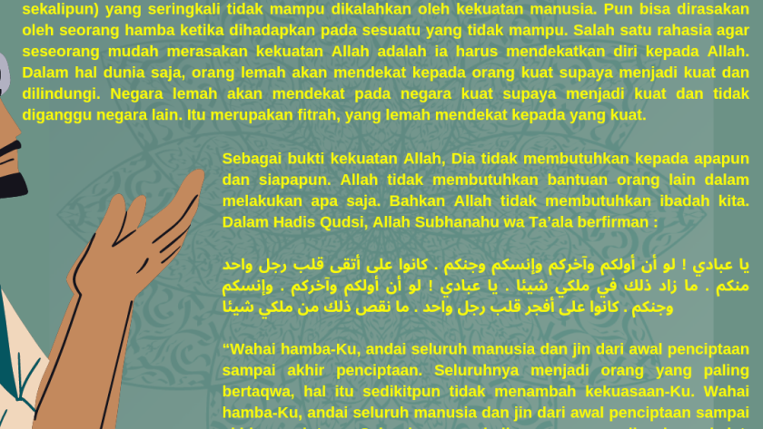 “Wahai hamba-Ku, andai seluruh manusia dan jin dari awal penciptaan sampai akhir penciptaan. Seluruhnya menjadi orang yang paling bertaqwa, hal itu sedikitpun tidak menambah kekuasaan-Ku. Wahai hamba-Ku, andai seluruh manusia dan jin dari awal penciptaan sampai akhir penciptaan. Seluruhnya menjadi orang yang paling bermaksiat, hal itu sedikitpun tidak mengurangi kekuasaan-Ku” (HR. Muslim )