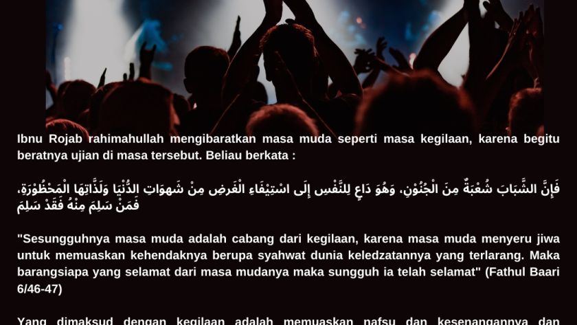 Ibnu Rojab rahimahullah mengibaratkan masa muda seperti masa kegilaan, karena begitu beratnya ujian di masa tersebut. Beliau berkata :