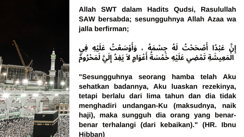“Sesungguhnya seorang hamba telah Aku sehatkan badannya, Aku luaskan rezekinya, tetapi berlalu dari lima tahun dan dia tidak menghadiri undangan-Ku (maksudnya, naik haji), maka sungguh dia orang yang benar-benar terhalangi (dari kebaikan).” (HR. Ibnu Hibban)