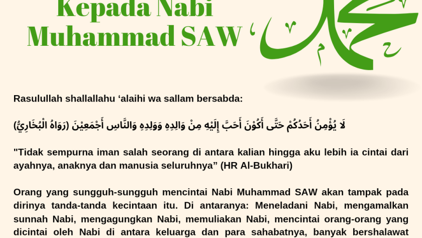 “Tidak sempurna iman salah seorang di antara kalian hingga aku lebih ia cintai dari ayahnya, anaknya dan manusia seluruhnya” (HR Al-Bukhari)