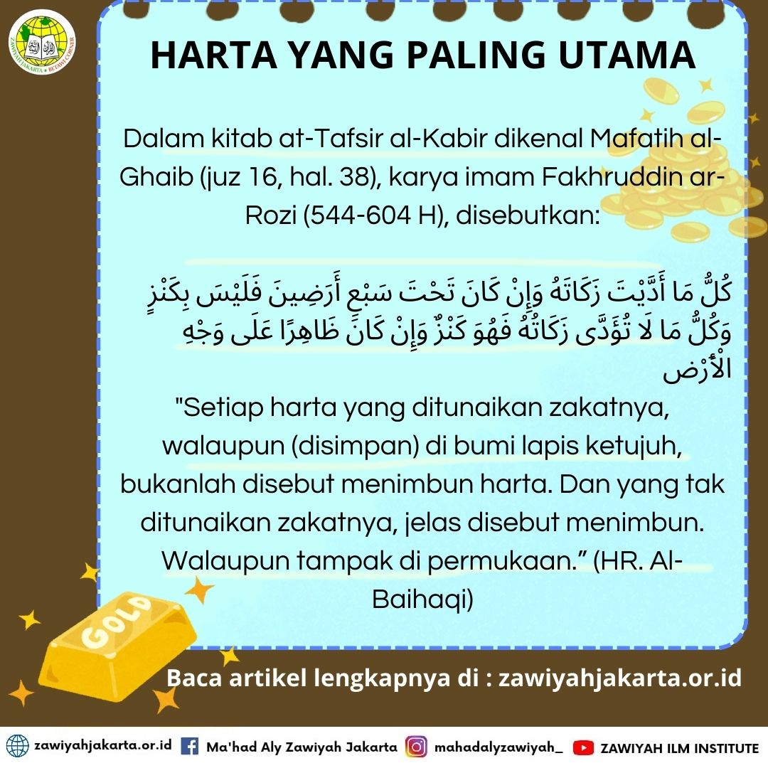 “Setiap harta yang ditunaikan zakatnya, walaupun (disimpan) di bumi lapis ketujuh, bukanlah disebut menimbun harta. Dan yang tak ditunaikan zakatnya, jelas disebut menimbun. Walaupun tampak di permukaan.” (HR. Al-Baihaqi)