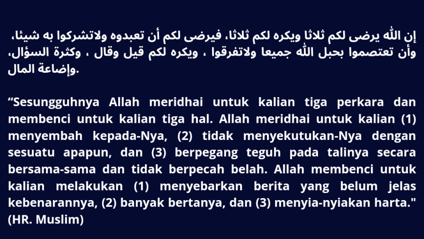 “Sesungguhnya Allah meridhai untuk kalian tiga perkara dan membenci untuk kalian tiga hal. Allah meridhai untuk kalian (1) menyembah kepada-Nya, (2) tidak menyekutukan-Nya dengan sesuatu apapun, dan (3) berpegang teguh pada talinya secara bersama-sama dan tidak berpecah belah. Allah membenci untuk kalian melakukan (1) menyebarkan berita yang belum jelas kebenarannya, (2) banyak bertanya, dan (3) menyia-nyiakan harta.” (HR. Muslim)