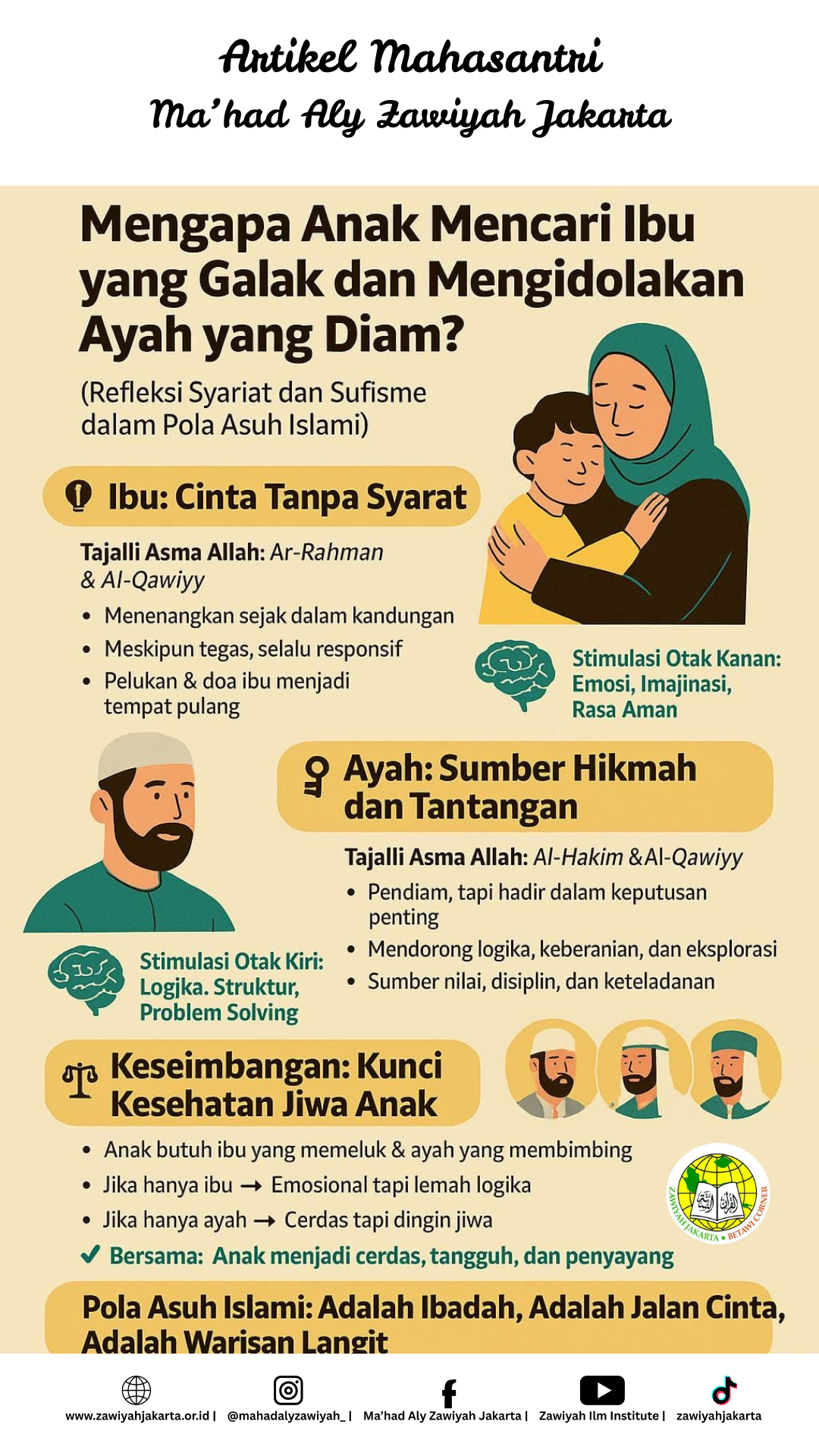 Dalam perjalanan panjang kehidupan, tak sedikit kita temui seorang ibu yang dikenal “galak”, keras mendidik, tegas dalam kata, namun justru menjadi tempat pertama anak berlari saat terluka, menangis, dan ingin dimengerti. Sementara sang ayah yang lebih pendiam, lebih jarang bicara, justru berperan besar dalam membentuk keberanian dan kecerdasan anak. Ini bukan sekadar kebiasaan budaya—ini adalah rahasia fitrah dan ketentuan Ilahi dalam membentuk keutuhan jiwa anak manusia.