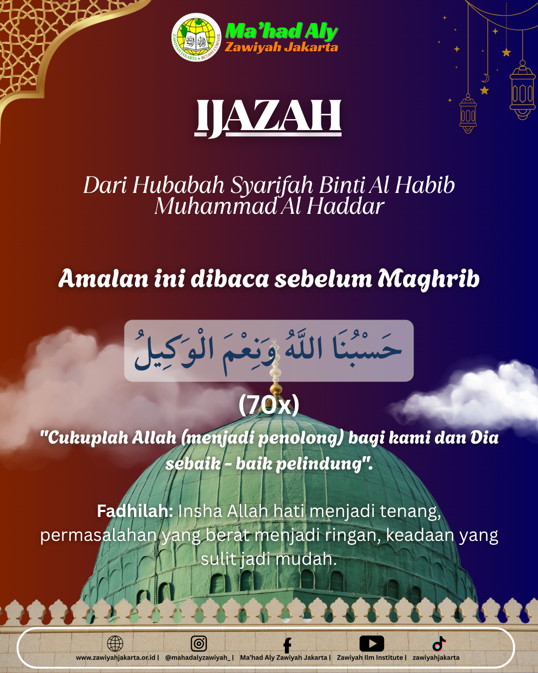 \#IjazahDoa #AmalanMaghrib #DzikirPetang #Hasbunallah #AmalanSalaf #DoaPenyejukHati #ZawiyahJakarta #MahadAlyZawiyah #SantriZawiyah #TarbiyahRuhiyah #DzikirHarian