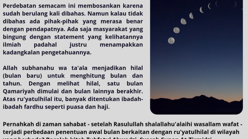 Pernahkah di zaman sahabat – setelah Rasulullah shalallahu’alaihi wasallam wafat – terjadi perbedaan penentuan awal bulan berkaitan dengan ru’yatulhilal di wilayah yang berbeda? Bacalah kitab Tuhfatul Ahwadzi, Syarah Sunan At-Tirmidzi باب ما جاء لكل أهل بلد رؤيتهم = Bab tentang Ru’yatulhilal bagi Setiap Penduduk Negeri)