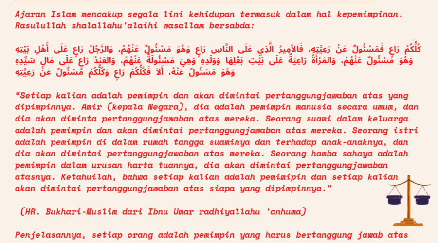 Oleh: Hayat Abdul Latief Ajaran Islam mencakup segala lini kehidupan termasuk dalam hal kepemimpinan. Rasulullah shalallahu’alaihi wasallam bersabda: كُلُّكُمْ رَاعٍ فَمَسْئُولٌ …