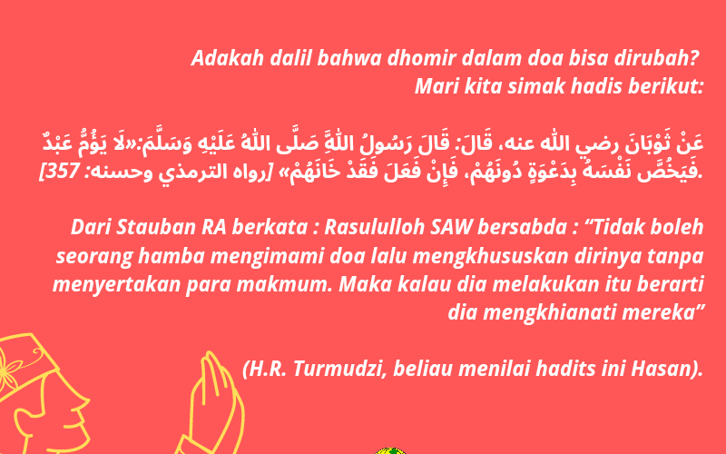 Oleh: Hayat Abdul Latief Di dalam Al-Qur’an ataupun hadits Nabi doa adakalanya menggunakan dhomir mufrod dan ada kalanya berdhomir jama”. Ketika berdoa …