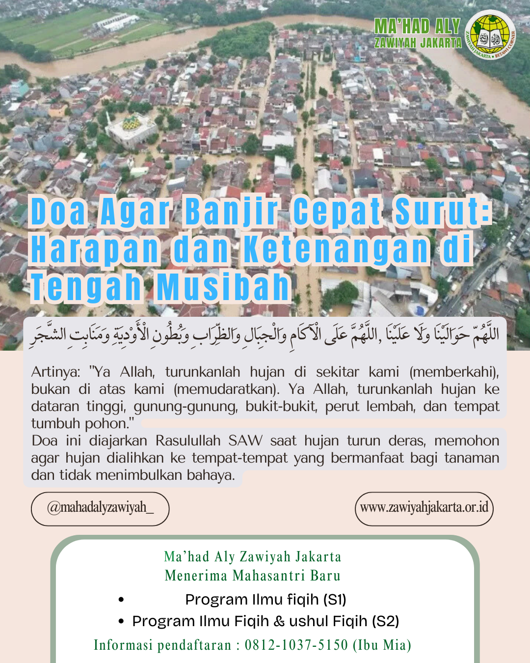 Belakangan ini, hujan deras melanda sejumlah wilayah di Jakarta, Bekasi, dan sekitarnya menyebabkan banjir di berbagai tempat. Kondisi ini tentu menguji kesabaran banyak orang. Dalam menghadapi musibah seperti ini, selain melakukan ikhtiar fisik seperti membersihkan saluran air dan menjaga lingkungan, kita juga dianjurkan untuk memanjatkan doa agar banjir cepat surut dan hujan membawa berkah.