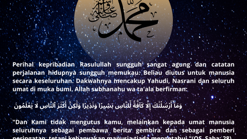 Perihal kepribadian Rasulullah sungguh sangat agung dan catatan perjalanan hidupnya sungguh memukau. Beliau diutus untuk manusia secara keseluruhan. Dakwahnya mencakup Yahudi, Nasrani dan seluruh umat di muka bumi. Allah subhanahu wa ta’ala berfirman: