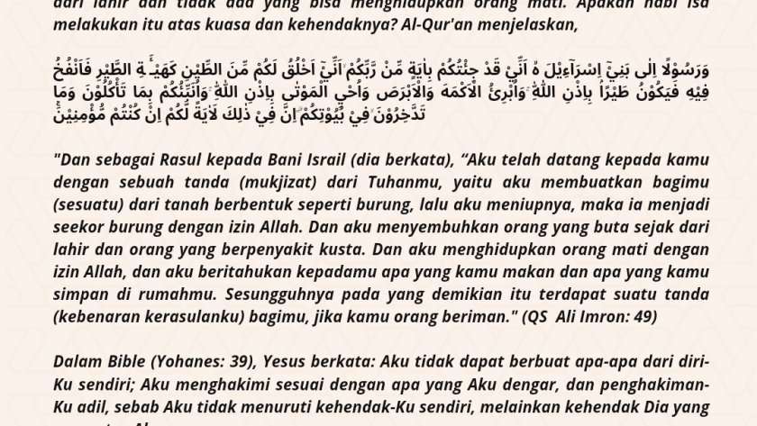 “Dan sebagai Rasul kepada Bani Israil (dia berkata), “Aku telah datang kepada kamu dengan sebuah tanda (mukjizat) dari Tuhanmu, yaitu aku membuatkan bagimu (sesuatu) dari tanah berbentuk seperti burung, lalu aku meniupnya, maka ia menjadi seekor burung dengan izin Allah. Dan aku menyembuhkan orang yang buta sejak dari lahir dan orang yang berpenyakit kusta. Dan aku menghidupkan orang mati dengan izin Allah, dan aku beritahukan kepadamu apa yang kamu makan dan apa yang kamu simpan di rumahmu. Sesungguhnya pada yang demikian itu terdapat suatu tanda (kebenaran kerasulanku) bagimu, jika kamu orang beriman.” (QS Ali Imron: 49)