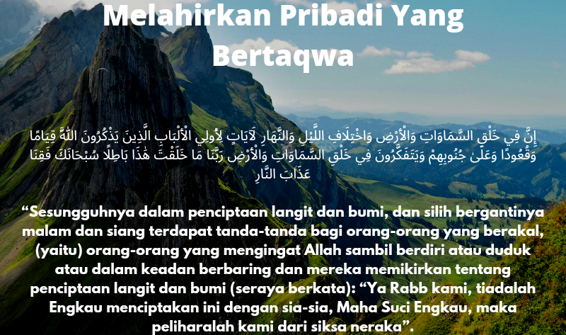 “Sesungguhnya dalam penciptaan langit dan bumi, dan silih bergantinya malam dan siang terdapat tanda-tanda bagi orang-orang yang berakal, (yaitu) orang-orang yang mengingat Allah sambil berdiri atau duduk atau dalam keadan berbaring dan mereka memikirkan tentang penciptaan langit dan bumi (seraya berkata): “Ya Rabb kami, tiadalah Engkau menciptakan ini dengan sia-sia, Maha Suci Engkau, maka peliharalah kami dari siksa neraka”. (QS Ali Imran [3]: 190-191).