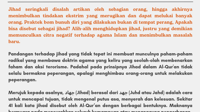 Jihad seringkali disalah artikan oleh sebagian orang, hingga akhirnya menimbulkan tindakan ekstrim yang merugikan dan dapat melukai banyak orang. Praktek bom bunuh diri yang dilakukan bukan di tempat perang, Apakah bisa disebut sebagai jihad? Alih-alih menghidupkan jihad, justru yang demikian memunculkan citra negatif terhadap agama Islam dan menimbulkan masalah baru.