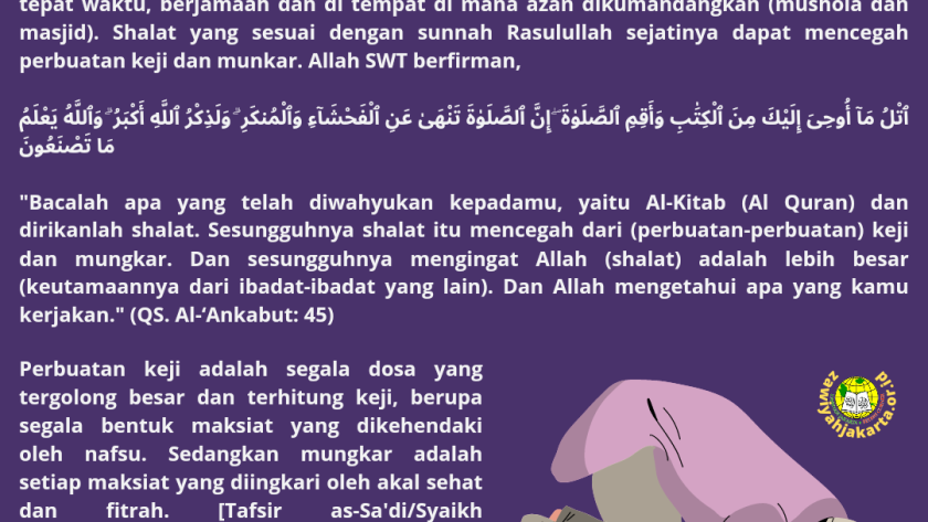 “Bacalah apa yang telah diwahyukan kepadamu, yaitu Al-Kitab (Al Quran) dan dirikanlah shalat. Sesungguhnya shalat itu mencegah dari (perbuatan-perbuatan) keji dan mungkar. Dan sesungguhnya mengingat Allah (shalat) adalah lebih besar (keutamaannya dari ibadat-ibadat yang lain). Dan Allah mengetahui apa yang kamu kerjakan.” (QS. Al-‘Ankabut: 45)