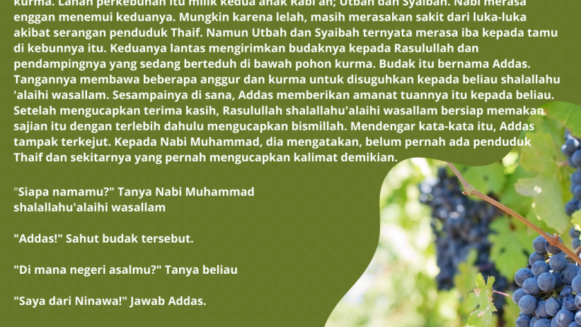 Tempat Rasulullah SAW beristirahat sehabis dikejar-kejar penduduk Thaif adalah kebun kurma. Lahan perkebunan itu milik kedua anak Rabi’ah; Utbah dan Syaibah. Nabi merasa enggan menemui keduanya. Mungkin karena lelah, masih merasakan sakit dari luka-luka akibat serangan penduduk Thaif. Namun Utbah dan Syaibah ternyata merasa iba kepada tamu di kebunnya itu. Keduanya lantas mengirimkan budaknya kepada Rasulullah dan pendampingnya yang sedang berteduh di bawah pohon kurma. Budak itu bernama Addas. Tangannya membawa beberapa anggur dan kurma untuk disuguhkan kepada beliau shalallahu ‘alaihi wasallam. Sesampainya di sana, Addas memberikan amanat tuannya itu kepada beliau. Setelah mengucapkan terima kasih, Rasulullah shalallahu’alaihi wasallam bersiap memakan sajian itu dengan terlebih dahulu mengucapkan bismillah. Mendengar kata-kata itu, Addas tampak terkejut. Kepada Nabi Muhammad, dia mengatakan, belum pernah ada penduduk Thaif dan sekitarnya yang pernah mengucapkan kalimat demikian.