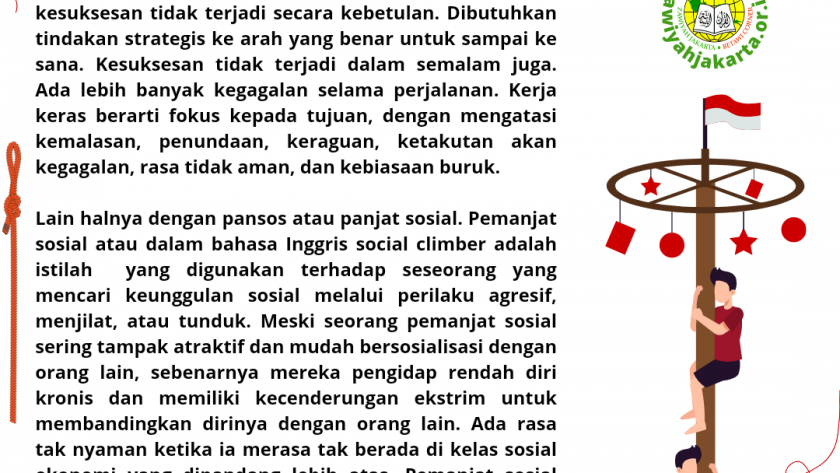Khulashah qaul, panjat sosial dengan menjilat, menghina nilai-nilai kesucian, menghujat tokoh terkenal dan pencitraan lebih mudah dilakukan untuk mencapai tujuan terkenal namun dengan cara yang tidak terpuji. Sedangkan panjang tebing dan panjat pinang merupakan representasi dari usaha mendapatkan kesuksesan dengan cara yang sesuai prosedur dari insan-insan yang memiliki jiwa petarung, jujur, pekerja keras, ulet dan sabar . Wallahu a’lam.