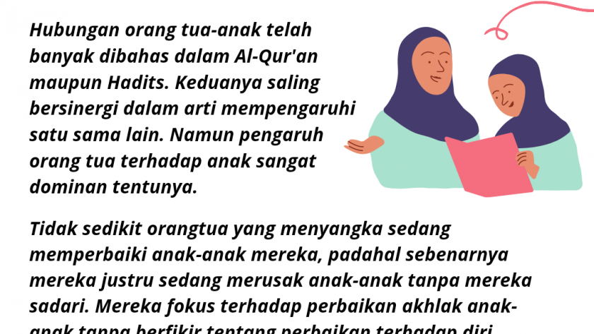 Hubungan orang tua-anak telah banyak dibahas dalam Al-Qur’an maupun Hadits. Keduanya saling bersinergi dalam arti mempengaruhi satu sama lain. Namun pengaruh orang tua terhadap anak sangat dominan tentunya.