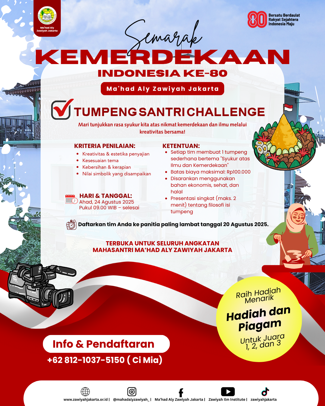 Dalam rangka memeriahkan Hari Ulang Tahun Kemerdekaan Republik Indonesia yang ke-80, Ma’had Aly Zawiyah Jakarta mengadakan: