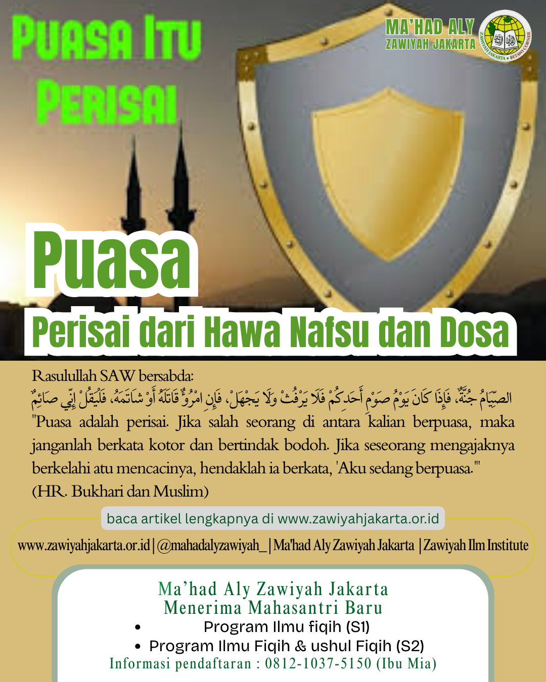 “Puasa adalah perisai. Jika salah seorang di antara kalian berpuasa, maka janganlah berkata kotor dan bertindak bodoh. Jika seseorang mengajaknya berkelahi atu mencacinya, hendaklah ia berkata, ‘Aku sedang berpuasa.'” (HR. Bukhari dan Muslim)