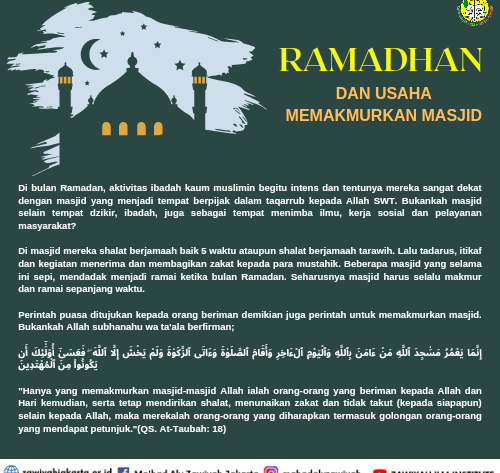 Di bulan Ramadan, aktivitas ibadah kaum muslimin begitu intens dan tentunya mereka sangat dekat dengan masjid yang menjadi tempat berpijak dalam taqarrub kepada Allah SWT. Bukankah masjid selain tempat dzikir, ibadah, juga sebagai tempat menimba ilmu, kerja sosial dan pelayanan masyarakat?