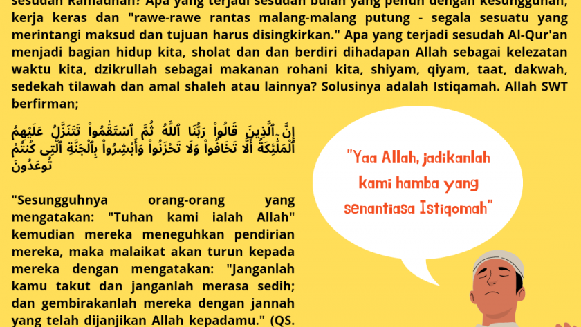 Ramadhan telah pergi dari hadapan kita. Pertanyaannya adalah apa kewajiban kita sesudah Ramadhan? Apa yang terjadi sesudah bulan yang penuh dengan kesungguhan, kerja keras dan “rawe-rawe rantas malang-malang putung – segala sesuatu yang merintangi maksud dan tujuan harus disingkirkan.” Apa yang terjadi sesudah Al-Qur’an menjadi bagian hidup kita, sholat dan dan berdiri dihadapan Allah sebagai kelezatan waktu kita, dzikrullah sebagai makanan rohani kita, shiyam, qiyam, taat, dakwah, sedekah tilawah dan amal shaleh atau lainnya? Solusinya adalah Istiqamah. Allah subhanahu wa ta’ala berfirman,