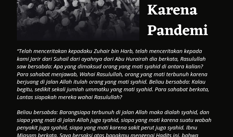 “Telah menceritakan kepadaku Zuhair bin Harb, telah menceritakan kepada kami Jarir dari Suhail dari ayahnya dari Abu Hurairah dia berkata, Rasulullah saw bersabda: Apa yang dimaksud orang yang mati syahid di antara kalian? Para sahabat menjawab, Wahai Rasulullah, orang yang mati terbunuh karena berjuang di jalan Allah itulah orang yang mati syahid. Beliau bersabda: Kalau begitu, sedikit sekali jumlah ummatku yang mati syahid. Para sahabat berkata, Lantas siapakah mereka wahai Rasulullah?
