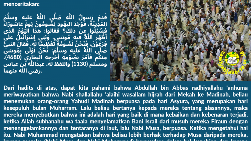 Dari hadits di atas, dapat kita fahami bahwa Abdullah bin Abbas radhiyallahu ‘anhuma meriwayatkan bahwa Nabi shallallahu ‘alaihi wasallam hijrah dari Mekah ke Madinah, beliau menemukan orang-orang Yahudi Madinah berpuasa pada hari Asyura, yang merupakan hari kesepuluh bulan Muharram. Lalu beliau bertanya kepada mereka tentang alasannya, maka mereka menyebutkan bahwa ini adalah hari yang baik di mana kebaikan dan kebenaran terjadi, ketika Allah subhanahu wa taala menyelamatkan Bani Israil dari musuh mereka Firaun dengan menenggelamkannya dan tentaranya di laut, lalu Nabi Musa, berpuasa. Ketika mengetahui hal itu. Nabi Muhammad mengatakan bahwa beliau lebih berhak terhadap Musa daripada mereka, karena mereka (Nabi Musa dan Nabi Muhammad) bersaudara dalam hal kenabian dan karena beliau lebih berhak taat, mengikuti kebenaran daripada mereka dan lebih layak bersyukur kepada Allah subhanahu wa taala karena telah menyelamatkan Musa ‘alaihis salam. Untuk itu beliau berpuasa dan memerintahkan umat Islam untuk berpuasa. Karena kita – umat Islam – lebih layak mencintai dan menyamai Nabi Musa daripada orang-orang Yahudi. Mereka mengubah dan mengganti syari’ahnya, sedangkan kita mengikuti Islam yang notabene agama semua nabi.