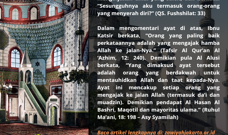 Dalam mengomentari ayat di atas, Ibnu Katsir berkata, “Orang yang paling baik perkataannya adalah yang mengajak hamba Allah ke jalan-Nya.” (Tafsir Al Qur’an Al ‘Azhim, 12: 240). Demikian pula Al Alusi berkata, “Yang dimaksud ayat tersebut adalah orang yang berdakwah untuk mentauhidkan Allah dan taat kepada-Nya. Ayat ini mencakup setiap orang yang mengajak ke jalan Allah (termasuk da’i dan muadzin). Demikian pendapat Al Hasan Al Bashri, Maqotil dan mayoritas ulama.” (Ruhul Ma’ani, 18: 198 – Asy Syamilah)